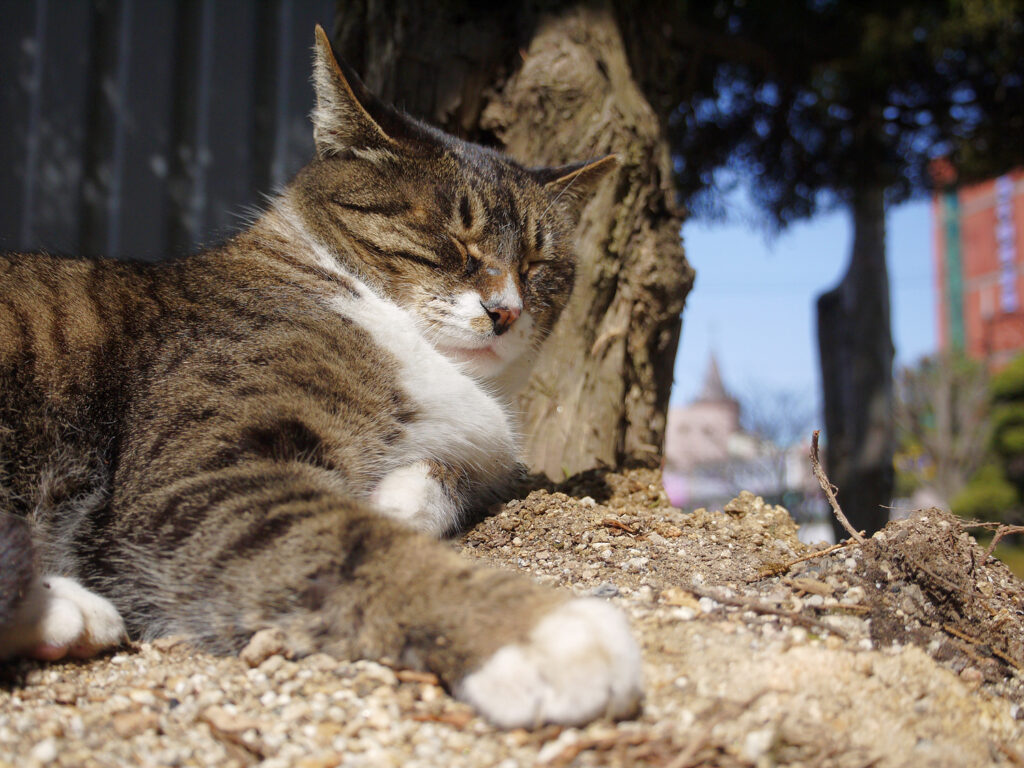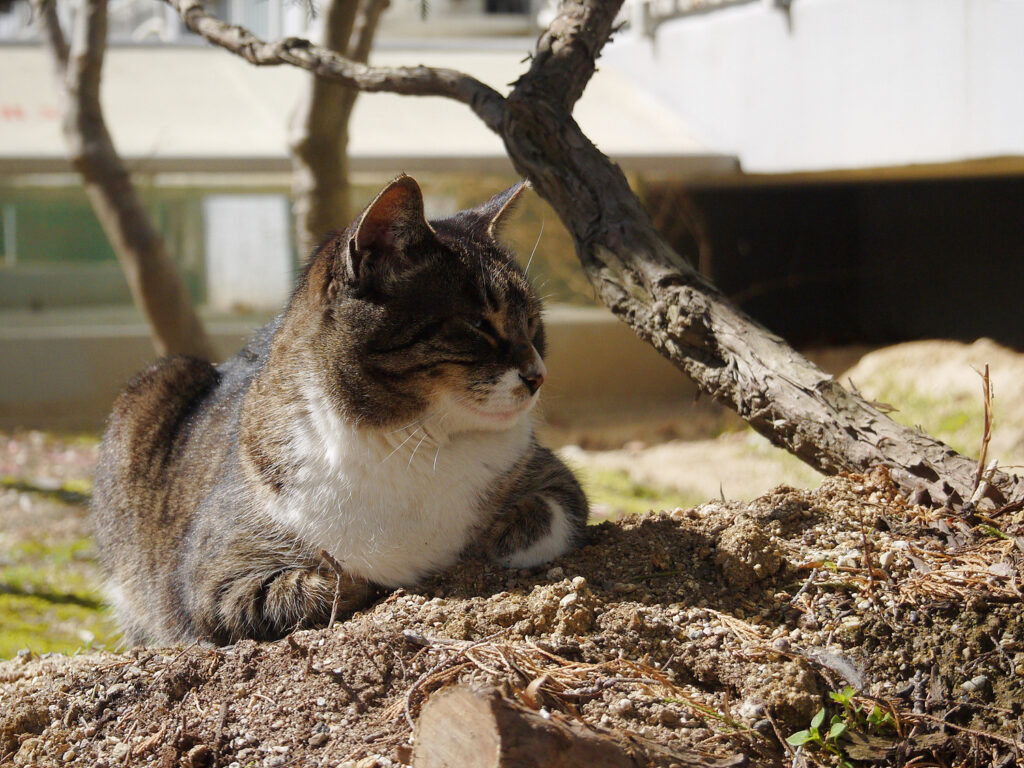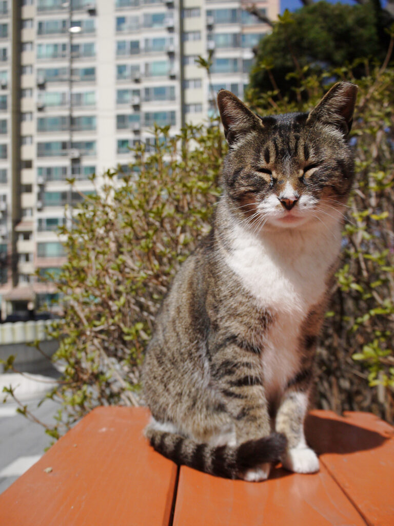 하늘은 파랗고 햇볕은 따뜻했던 14일, 늦은 산책을 나서다가 벤치에서 조는 고양이를 발견했다. 저 고양이를 절대로 놀라게 해선 안 돼, 항상 이런 마음가짐을 갖고, 멀리서부터 조심조심 한 발짝씩 다가가면서 망원으로 촬영하곤 했다. 이번에도 마찬가지였다. 주머니에 손을 넣어 올림푸스 14-42 ez 렌즈를 물린 파나소닉 gf2를 꺼내 들었다. 그렇게 아주 조심스럽게 다가가는데, 이 고등어무늬 고양이는 미동도 없었다. 뭐지? 벤치 반대쪽 끝에 앉아 본다. 그래도 고양이는 애옹애옹 소리만 낼 뿐 가만히 있다. 이만큼 가도 괜찮아? 이만큼도? 요만큼도? 요오오만큼도? 머리와 목덜미를 쓰다듬어도 가만히 있다가, 한참 뒤 폴짝 내려가 보도를 걸었다. 그러곤 또 그 자리에 앉았다.