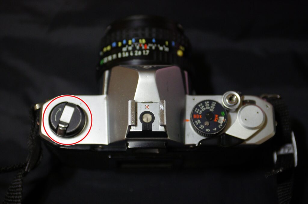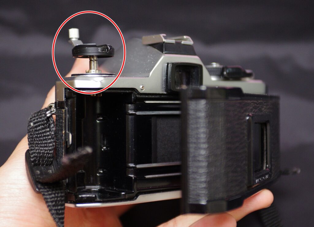 왼쪽 어깨를 보시면 이렇게 노출보정 다이얼이 되감기 레버 부분을 감싸고 있는데요. 저 다이얼을 살짝 들어올린 채로 돌리면 감도 수치가 바뀝니다.