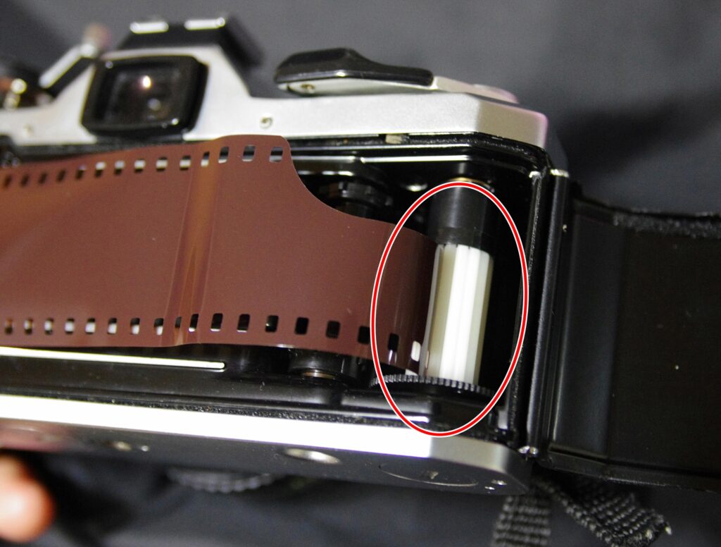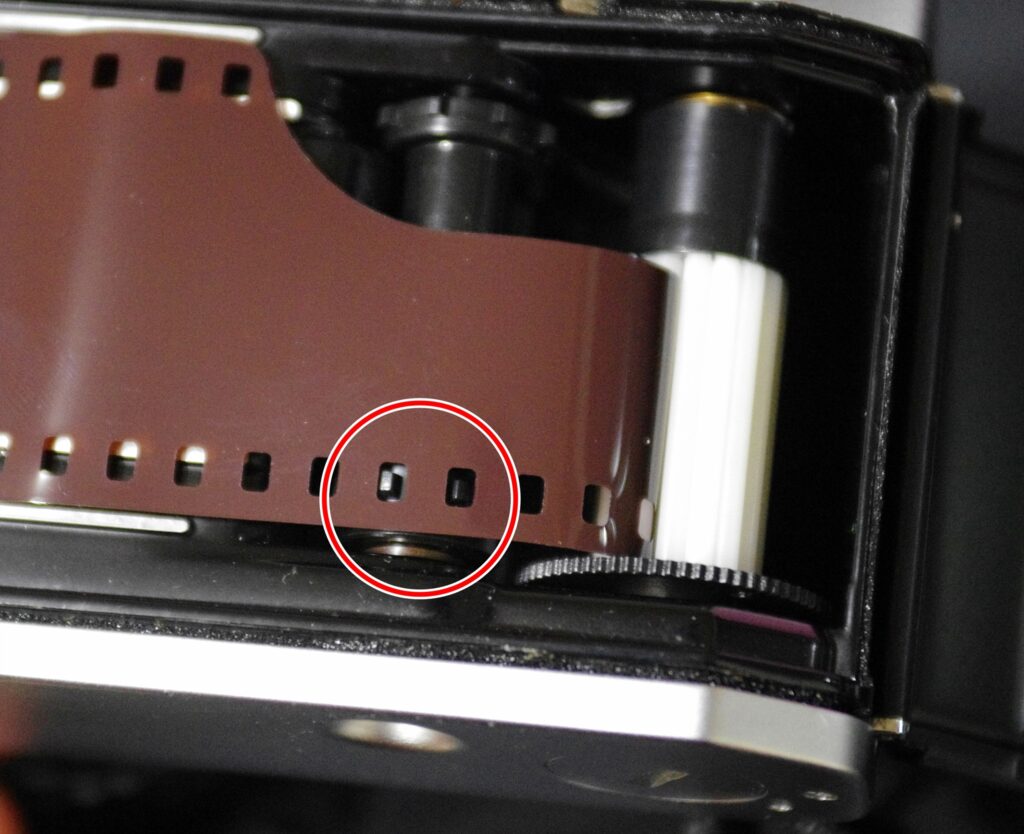 그리고 이 동그라미 친 부분을 주목하세요. 까만 톱니 비슷한 것이 있지요? 필름에는 필름을 원활히 감기 위해 구멍이 촘촘히 나 있습니다. 이 구멍에, 톱니가 정확히 맞아 들어가야 합니다. 장전 레버를 한 번 천천히 젖히면서, 다른 손으로 저 구멍을 정리해주세요. 톱니가 필름 구멍에 맞아 들어가는지 확인하시면서, 만약 어긋나 있다면 손으로 필름을 밀어 맞춰주세요. 저게 잘 안 맞으면 필름이 제대로 감기지 않을 수 있습니다.