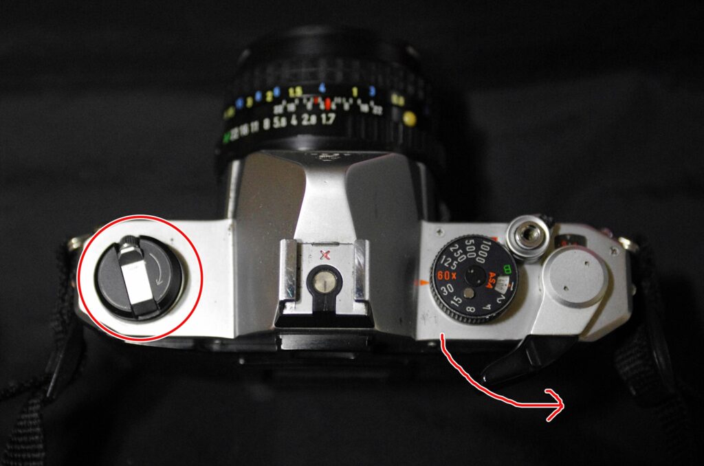 다시 장전 레버를 힘차게 젖혀봅시다. 이때, 빨갛게 동그라미 친 부분이 함께 돌아가는지 꼭 확인하셔야 합니다. 장전 레버는 젖혀지는데 되감기 레버가 안 돌아간다면, 필시 필름이 제대로 안 꽂힌 경우입니다. 이 때에는 다시 뚜껑을 열고 필름이 들어간 상태를 점검해보셔야 합니다. 물론 한두 컷이 버려지겠지만, 한두 컷을 버려서 34~35컷을 살리는 셈이니, 꼭 확인하십시오.