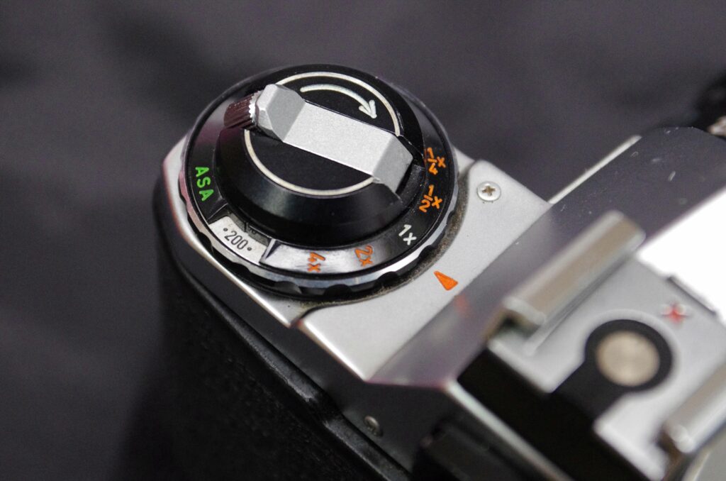 펜탁스 mx는 위 사진에서 보시는 바와 같이 셔터속도 다이얼에 감도 설정 기능이 붙어 있습니다. 숫자 15 옆에 있는 은색 버튼을 누른 채로 다이얼을 돌리면, ASA라 쓰인 곳에 있는 창에서 숫자가 바뀌는 것을 확인하실 수 있는데요. 이 숫자가 감도입니다. 증감 또는 감감 현상(현상 과정에서 감도를 끌어올리거나 내리는 기법)을 염두에 둔 경우가 아니라면 보통 필름통에 적힌 숫자와 맞춰주시면 됩니다. 물론 필름의 감도를 자동으로 인식해서 설정해 주는 카메라라면 딱히 신경 쓰실 필요는 없을 것 같습니다.