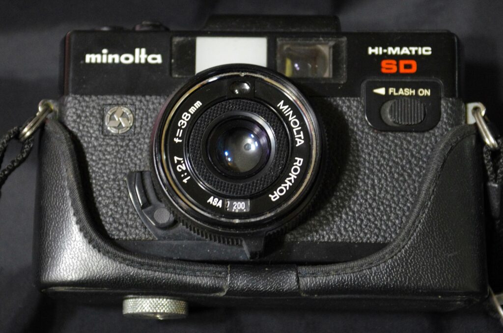흔히 볼 수 있는 프로그램노출 목측식 카메라 하이매틱 SD인데요. 렌즈가 붙박이인 카메라들 중에는 이렇게 감도 설정 기능이 렌즈 부분에 달린 것도 있습니다. 안쪽 요철이 있는 링을 돌리면 감도 수치가 조절됩니다.