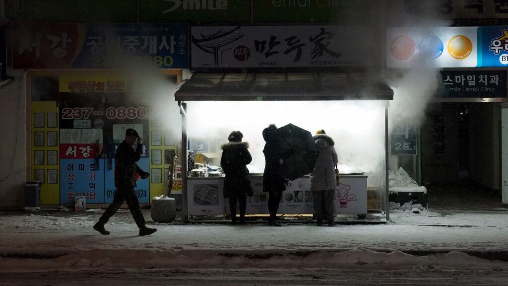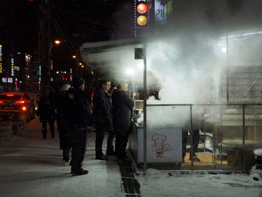 눈이 정말이지 하염없이 쏟아지는데, 유독 하얗게 빛나는 곳이 있었다. 지나가던 사람들은 죄다 홀린 듯이 그 앞으로 가 줄을 섰다. 만두가게였는데, 평소에는 딱히 찐 만두를 좋아하지 않는 나도 이성을 잃고 가서 줄을 설 수밖에 없었다. 그 마력이 지하철 델리만주와 동급이다.