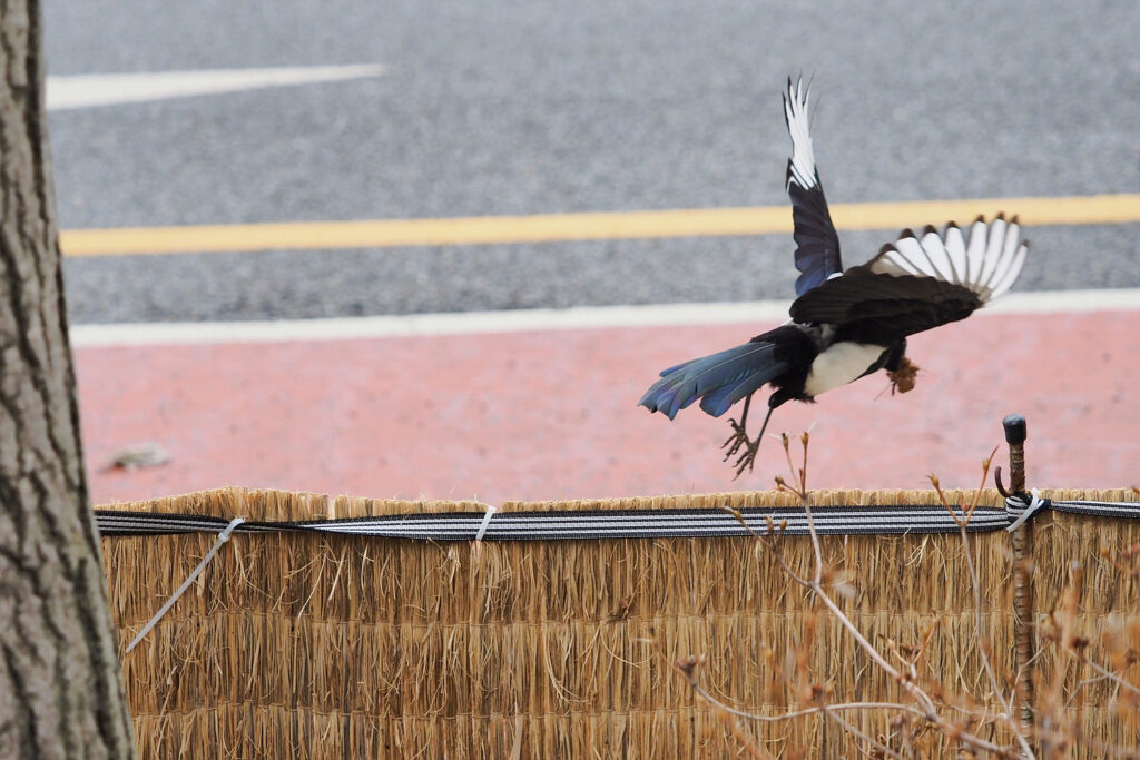2021.02.06. 낙엽을 물고 이륙하는 까치. 아마 둥지 바닥에 깔 모양이다.