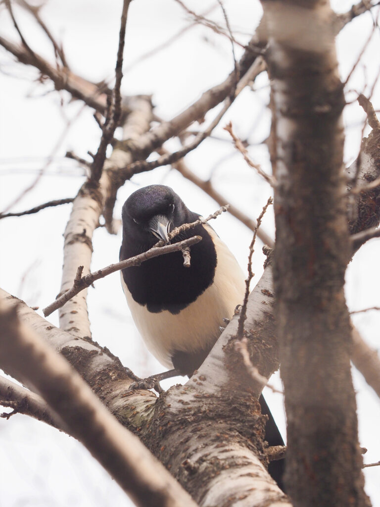 2021.02.06. “뭘 봐?” 나뭇가지를 문 채 이쪽을 바라보는 까치.