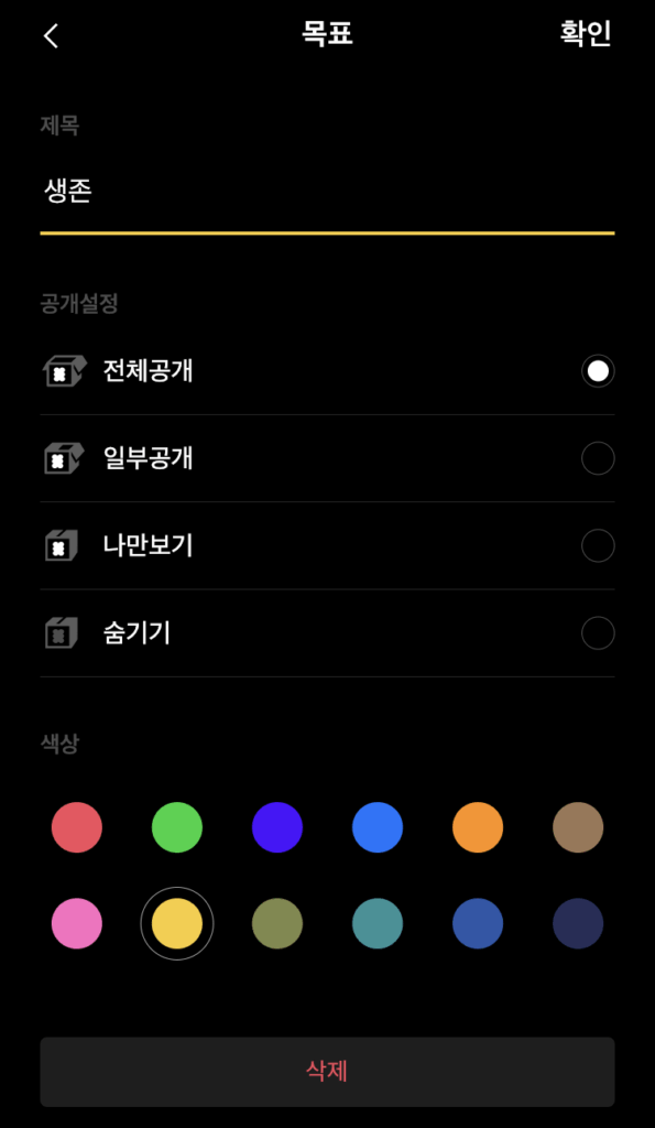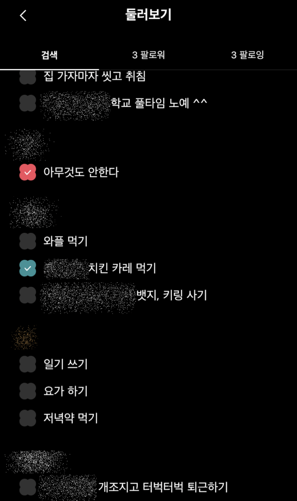 사생활을 너무 공개하는 것 같아서 걱정이라면, 카테고리별로 공개범위를 설정해 놓으면 된다. 그러니까 그냥 SNS를 하듯이. 전체 공개, 일부 공개(팔로워 지정), 나만 보기, 숨기기 등 4가지 중에서 선택할 수 있고, ‘전체 공개’로 설정한 일정은 ‘둘러보기’ 탭에 공개되기도 한다. 며칠 전엔 어떤 사람이 “오늘도 숨쉬었다”라는 일정을 써놓고 완료 체크를 했길래 따봉 이모티콘을 줬고, 방금은 또 다른 사람이 “광야로 걸어가기”라는 일정에 완료 체크한 것을 보고 불꽃 이모티콘을 주고 왔다.