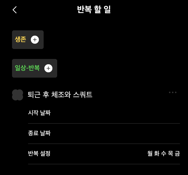 반복되는 일은 따로 반복 설정을 해놓으면 된다. 이게 또 영리한 것이, 반복 설정한 일정이 기계적으로 등록되는 게 아니라 당일 추가 버튼을 눌러 원터치로 등록하는 방식이라는 점이다. 그날그날 일정을 미리 살펴보지 않으면 안 되게끔 돼 있다.