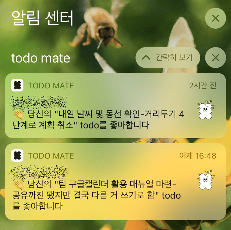 Todo mate에서는 친구를 팔로우할 수 있다. 공개범위 설정에 따라 친구가 무엇을 해야 하는지, 무엇을 완수했는지 볼 수 있다. 어떤 일정을 작성해놓고 나중에 완료했다고 표시하면, 팔로워가 알림을 켜놓은 경우 실시간 푸시 알림으로 보고(?)를 받을 수 있다. 그러면 그 즉시 앱을 켜서 8가지 이모티콘 중 하나를 골라 남길 수 있다. 이모티콘은 전부 ‘기쁨’이나 ‘칭찬’, ‘축하’의 의미를 담은 것들이다. 무슨 잔소리를 한다거나 비난한다거나 하는 것은 있을 수 없다. 그러면 무슨 일이 벌어지는가? 칭찬을 받기 위해 뭐라도 적어놓고 그것을 수행하게 된다. 사람이 참 간사한 것이다. 물론 써놓기만 하고 실제론 딱히 하지도 않았으면서 완료 표시를 할 수도 있겠지만…… 굳이…? 왜…?