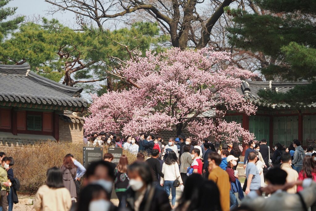 이날의 주인공은 명백히 궁 자체가 아니라 궁역에 핀 꽃이었다. 나만 그렇게 생각한 것은 물론 아니어서, 꽃을 주렁주렁 풍성하게 달고 있는 나무가 있다면 으레 그 앞에 긴 줄이 생기곤 했다. 예쁜 것을 보면 나도 예뻐지고 싶은 것은 자연스러운 이치. 그런 자기 모습을 남기는 것은 중요하다. 그것이 삶이고 기록이니까―(끄덕).