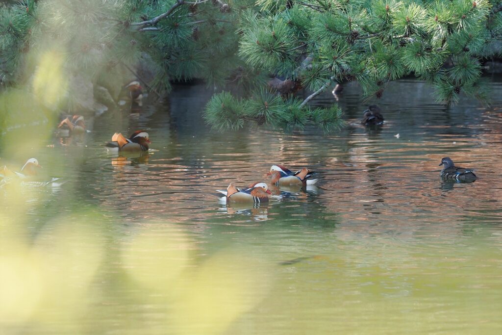 춘당지의 원앙들은 아주 신이 났다. 수컷들끼리 쫓고 쫓기는 놀이(?)를 하기도 하고, 자맥질을 하다가 날개를 퍼덕이기도 한다. 한쪽 구석에는 짝짓기를 하는 커플도 있다. 다만 먹이를 주지 말라는 팻말을 무시하고 자꾸 먹이 같은 것을 던지는 일부 사진사의 행태가 그 분위기를 흐릴 뿐이다.