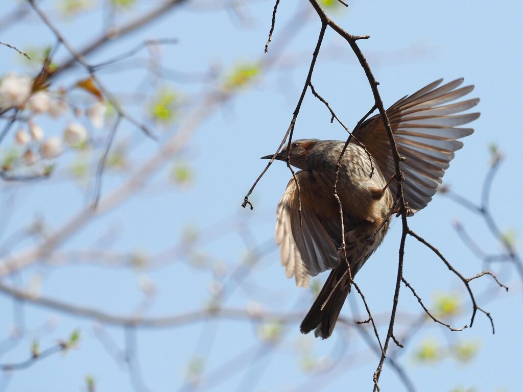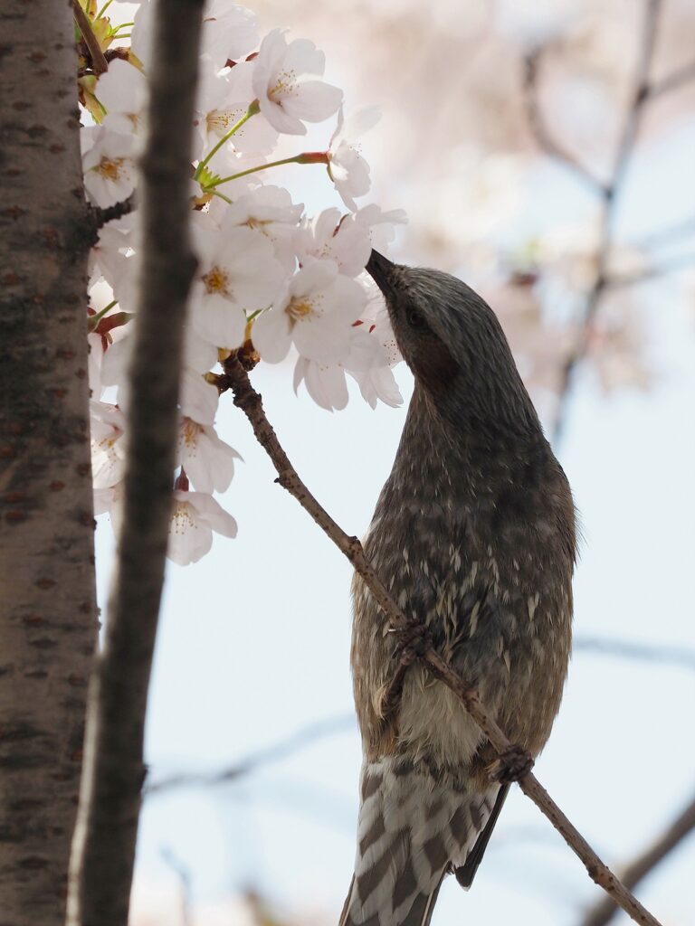 벚꽃을 좋아하는 새는 물론 직박구리가 전부가 아니다. 부리가 짧아서 직박구리처럼 할 수 없는 참새들은 꽃을 똑똑 잘라서 아래에서 꿀을 내 먹는 방식을 쓴다. 가지에 앉은 채 꽃을 물고 있는 참새들을 어렵지 않게 만날 수 있었다. 꿀을 다 먹고 나면 꽃은 가차 없이 버린다. 꽃은 꿀만 내준 채로 온전한 형태를 유지하며 바닥에 떨어진다. 꿀벌 입장에서는 조금 속상한 일이 될지도 모르겠다.