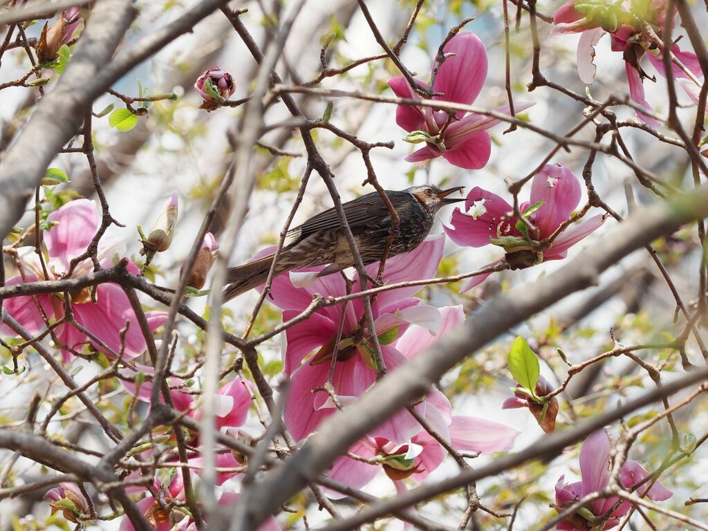 하도 사람이 많아서 새들이 어디 멀리 가버렸을까 걱정했지만 다행히 그렇지는 않았다. 직박구리 두어 마리가 뺙뺙 소리를 내며 벚나무 가지에 앉았다. 한 마리는 꽃에 머리를 집어넣고 꿀을 먹고 있었다. 원래 사람을 그다지 겁내지 않는 직박구리들답게, 그냥 막 정신없이 이 꽃 저 꽃 바꿔가며 머리를 들이댔다. 한참을 그러다가 예의 그 “뺙!” 소리를 내면서 다른 곳으로 날아갔다.