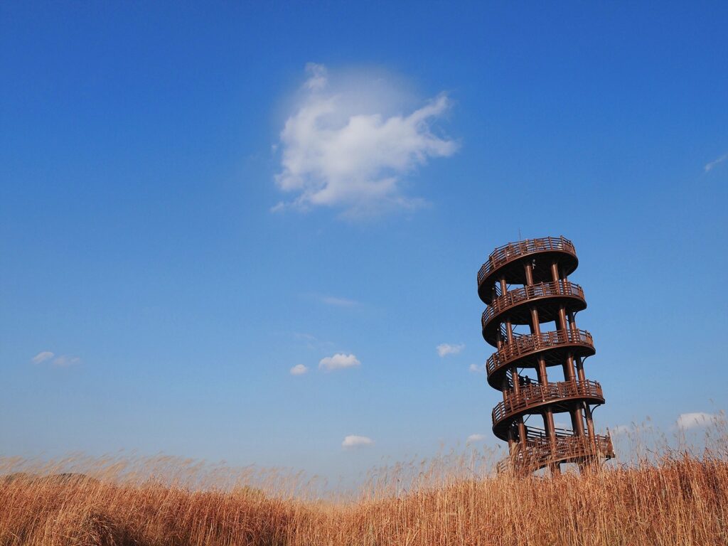 유독 눈에 띄는 것은 저어새다. 그 흙탕물에 고개를 처박고 이리저리 부리를 젓고 있다. 결코 노는 시간이 아니다. 언제 왔는지 모를 쇠오리들이 비탈을 바삐 오간다. 그 걸음걸음마다 조그만 발자국이 찍힌다. 그 옆 흰뺨검둥오리와의 체격 차이가 인상적이다. 갯골이 훅 꺾이는 자리, 인공과 자연의 경계쯤에 전망대가 서 있다. 5층 정도의 높이로, 꼭대기에 서면 구불구불 갯골과 주변 지역이 한눈에 들어온다.