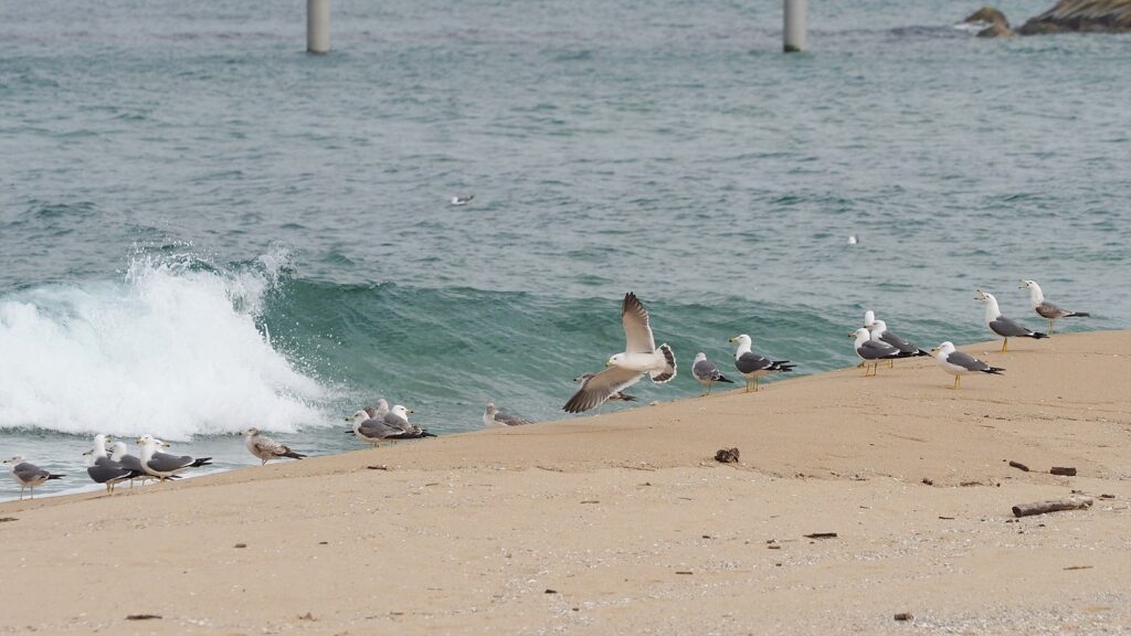 아직은 겨울의 끝자락, 봄의 문지방을 넘기 직전 같은 날씨였다. 멀리 보이는 산맥에도 며칠 전 내린 눈의 흔적이 얼핏 보이는, 그런 날. 푹푹 빠지는 모래를 밟고 걸어가 물가에 섰다. 이날따라 유독 바람이 세차게 불었다. 멀리서부터 도움닫기하며 달려온 파도가 하얗게 부서지며 물방울을 쏟아낸다. 거무튀튀한 바위의 몸통 이곳저곳에 물이 고인다. 고개를 들면 물빛은 점점 아득해진다. 마루와 골 사이를 오르내리며 까딱까딱하는 부표 근처로 갈매기 몇 마리가 날았다.