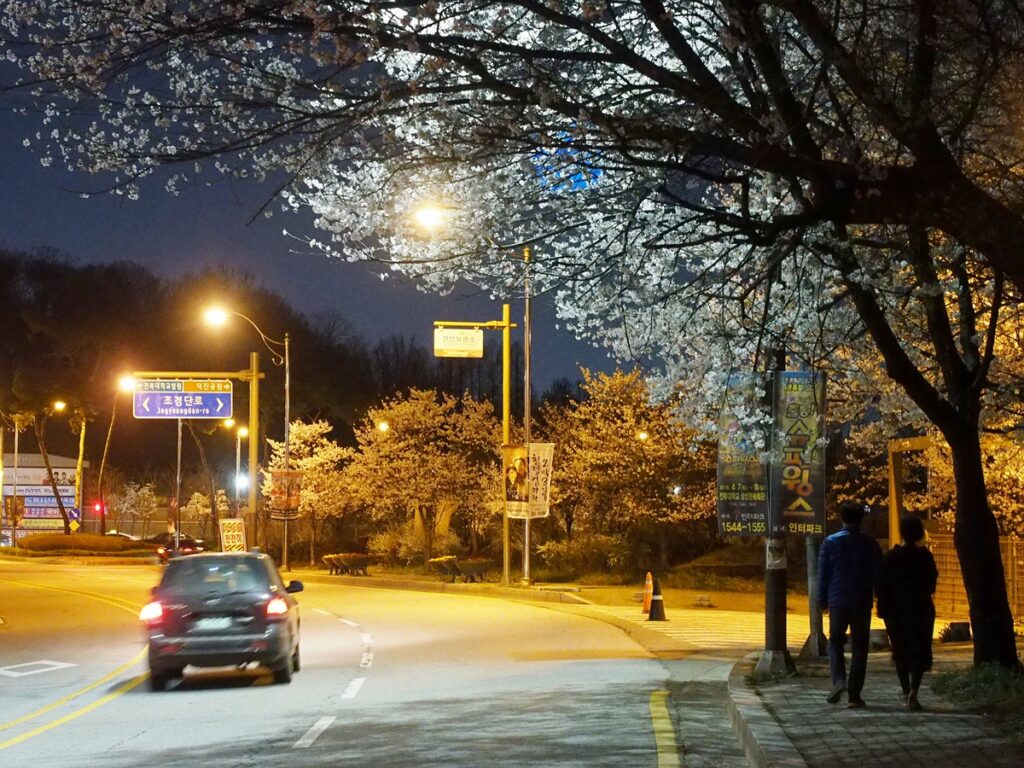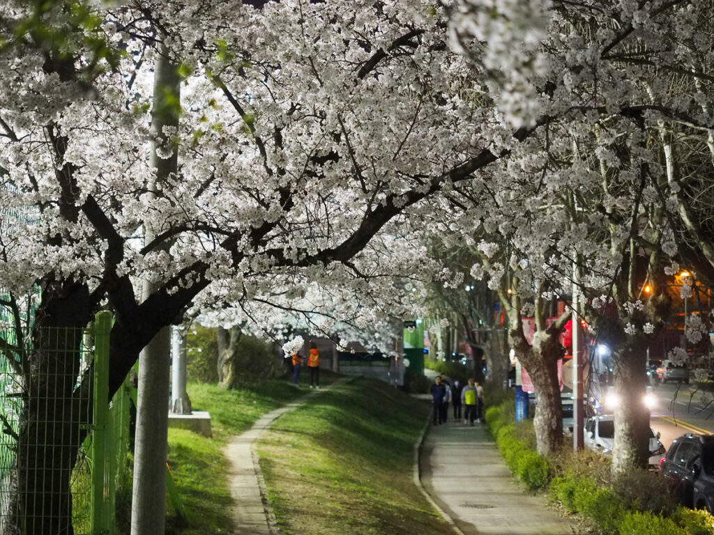 저녁에 퇴근해서는 소리전당 앞 벚꽃길로 갔다. 밤에 보는 벚꽃은 물론 아름답다. 전에는 전주의 대표적인 벚꽃 명소인 전주동물원이 야간개장을 하고 막 그랬었는데 올해는 소식이 없다. 동물들도 쉬어야 하니까.