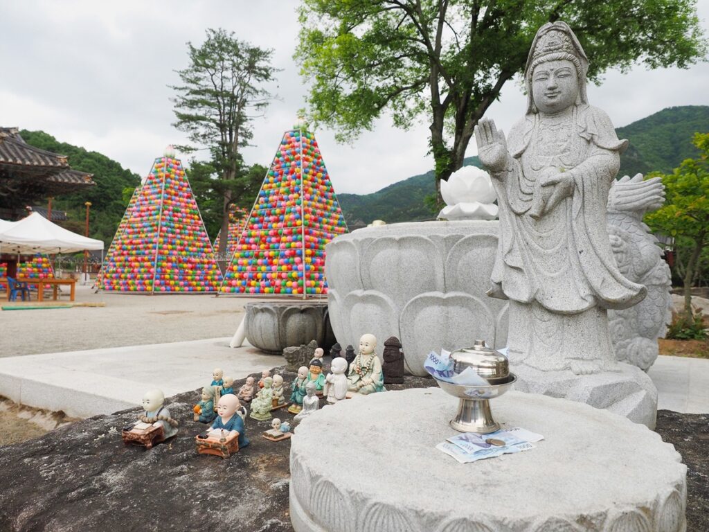 그리고 석가탄신일을 앞둔 지금은 연등이 이 절의 자랑이다. 이곳은 연등을 탑처럼 쌓아 올리곤 하는데, 오방색 탑이 여럿이 서 있는 그 한가운데에서 염불 외는 소리를 듣고 있으면 약간 이 세상이 아닌 것 같은 느낌도 받는다.
