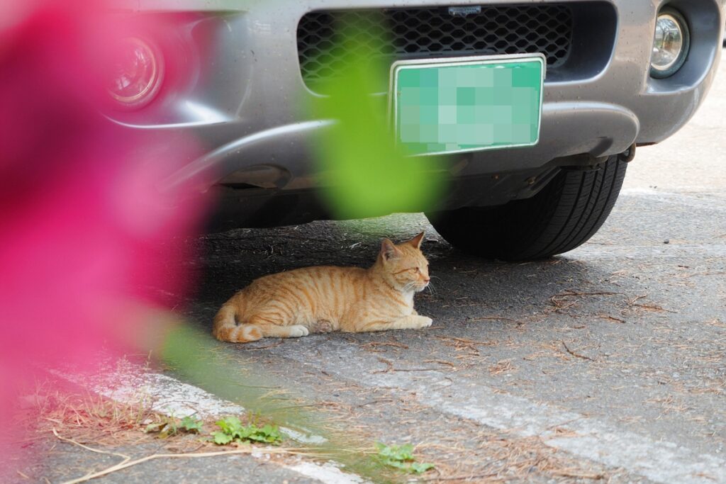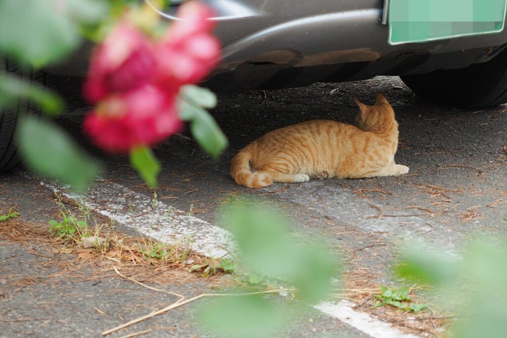 점심을 먹으러 나섰는데, 이번에는 노란 고양이가 주차된 자동차 아래 그늘에서 쉬고 있는 것을 봤다. 볕이 뜨거우니 차 아래 그늘이라도 찾아 들어가야 하는 모양이다. 저쪽을 계속 바라보길래 뭐가 있나 했는데, 잠시 뒤에 까치로 보이는(정확히는 못 봤다) 새가 날아 오르는 게 보였다. 아마 그걸 보고 있었던 것 같다. 앞의 꽃은 장미다.
