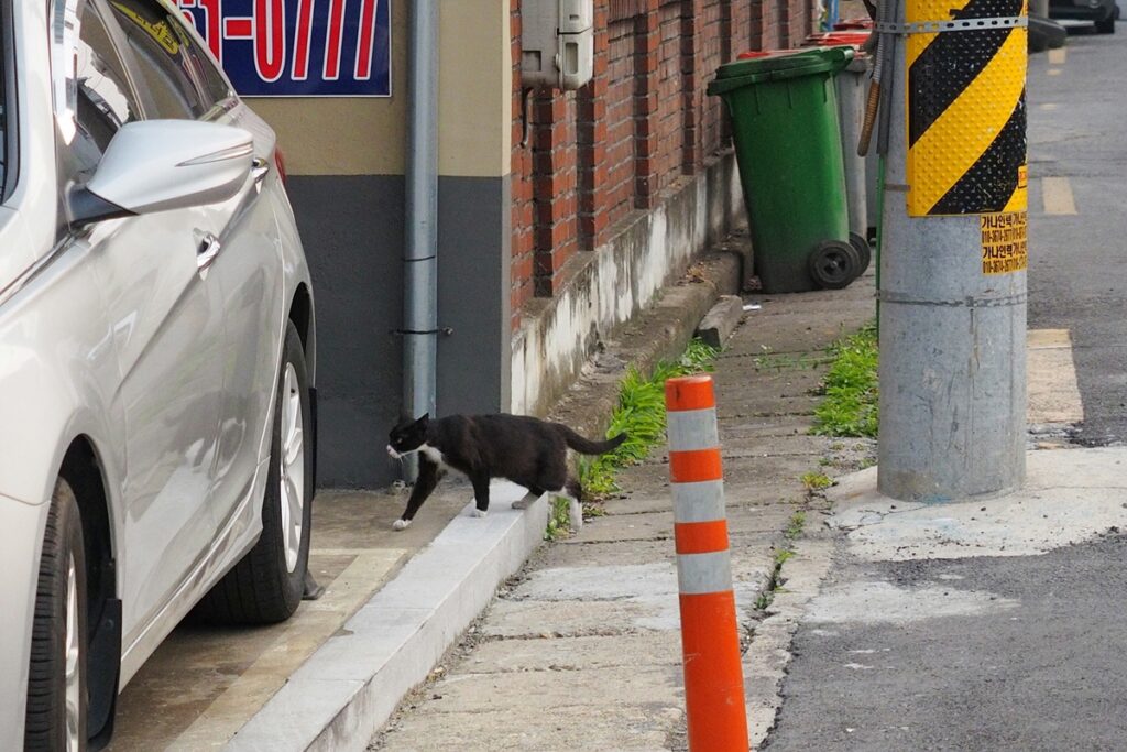 이런 고양이도 만났다. 멀리서부터 당당히 걸어오다가 역시 자동차 밑으로 들어갔다. 주변에서 다른 고양이의 울음소리가 들렸는데, 그 녀석은 찾을 수 없었다. 그런데 어쩌면 전에 봤던, 꼬리를 크게 다친 녀석 목소리는 아니었을까 하는 생각도 든다.