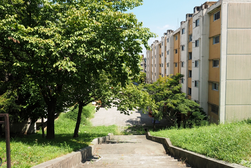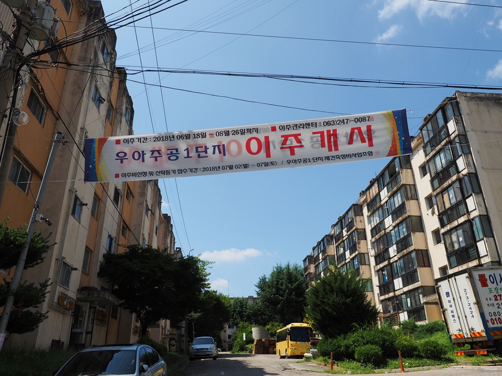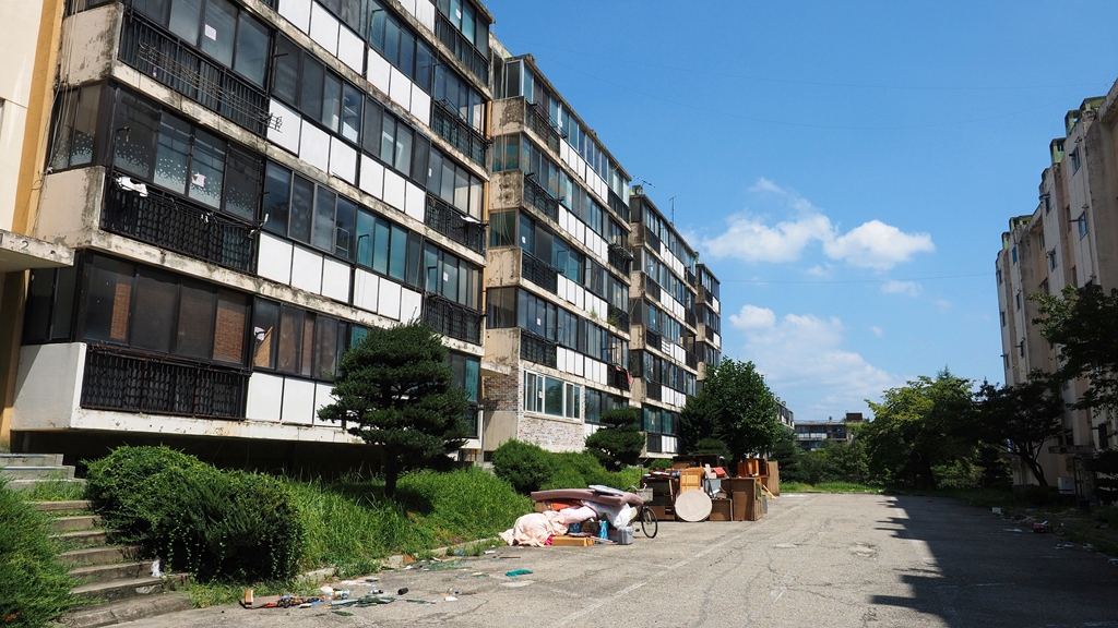 집집마다 ‘출입 금지’ 표찰이 붙었다. 단지 내를 돌아다니는 동안 만난 사람이라곤 고물을 수집하는 이 한 명 정도였다. 공시된 이주 기간이 마감됐으니 아마 거의 빈집일 것이다. 한때 주차공간 부족으로 몸살을 앓았을 저 주차장을 대형폐기물 더미들만이 차지하고 있다. 그래도 구석구석을 보면 차가 아주 없는 것은 아니었다. 특히 도로에서 가까운 주차장에는 차가 제법 있었다. 단지 안에 있는 유치원도 ‘이전하지 않고 이 자리에서 계속 운영된다’는 내용의 현수막을 내걸고 있었다.