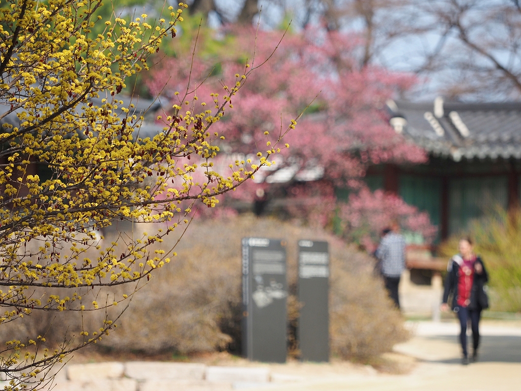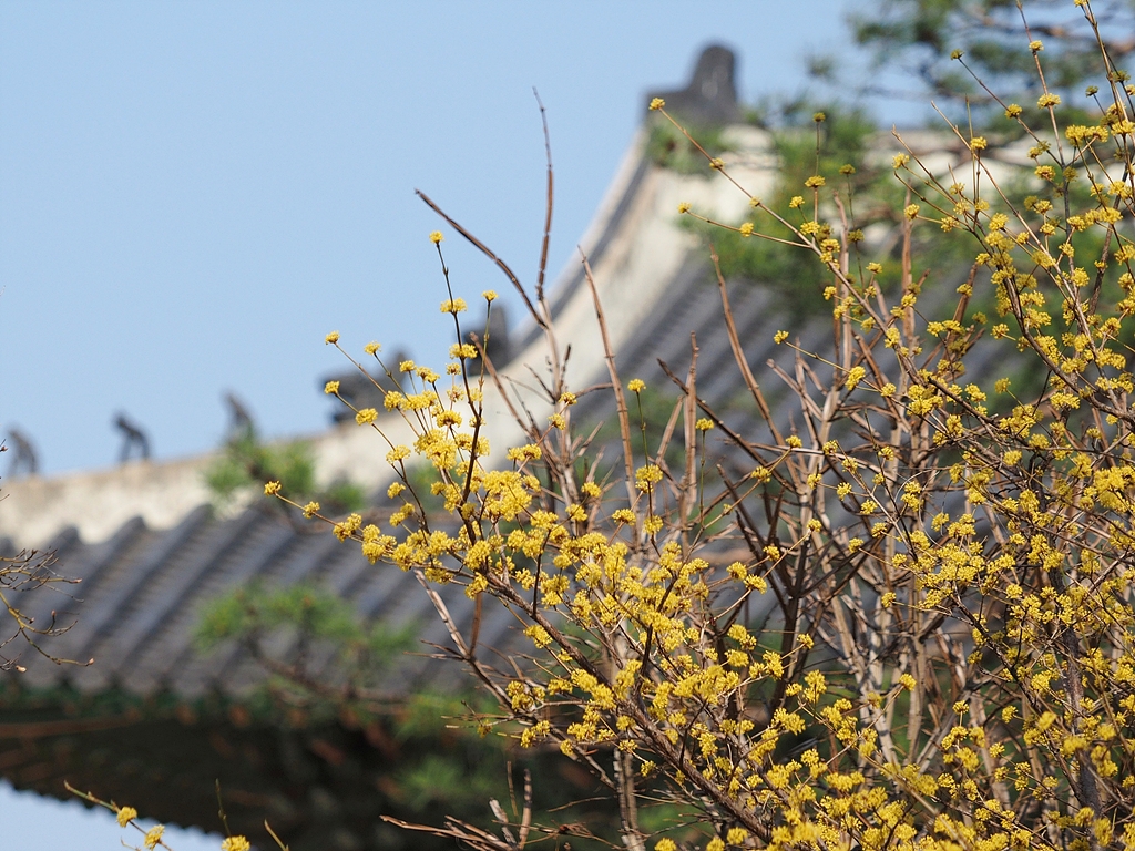 검은 기와지붕 앞에 노란 꽃을 놓으면 색이 분명하게 드러나서 좋다.