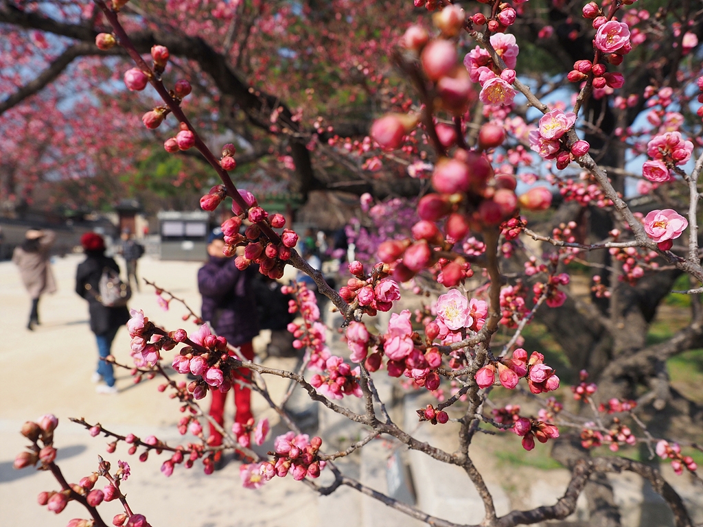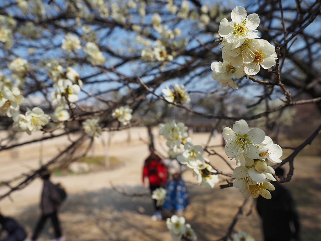 망원단의 원근압축효과를 이용해서 서로 다른 색을 화면에 포개어 놓을 수 있다. 원근감은 피사계 심도가 처리해줄 것이다. 전구간 조리개값이 2.8이라서 어느정도 심도 표현이 가능하다. 배경의 홍매화가 몽글몽글하게 표현된 것도 마음에 든다.